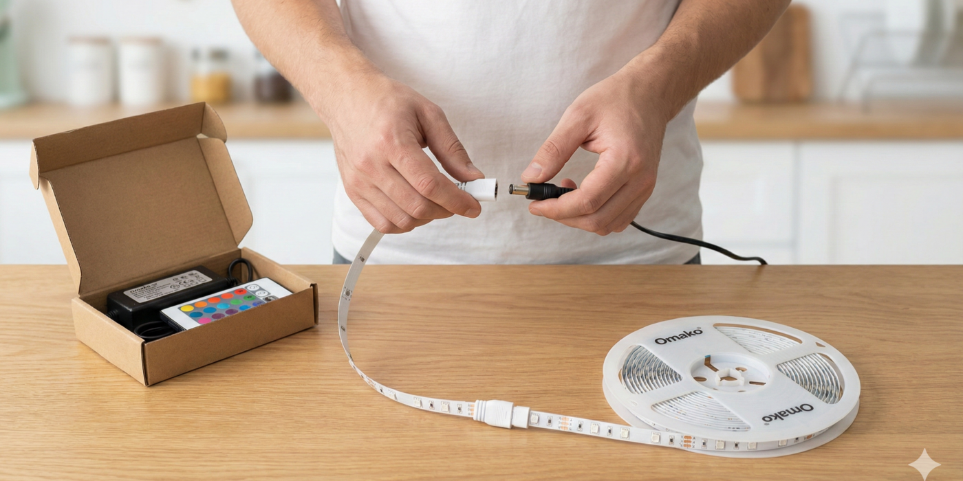 - Wyliczenie elementów: taśma LED (np. 5m), idealnie dopasowany zasilacz wtyczkowy (jak do laptopa), ewentualnie sterownik/pilot (jeśli to zestaw RGB). Podkreślenie, że elementy są już ze sobą „sparowane”.